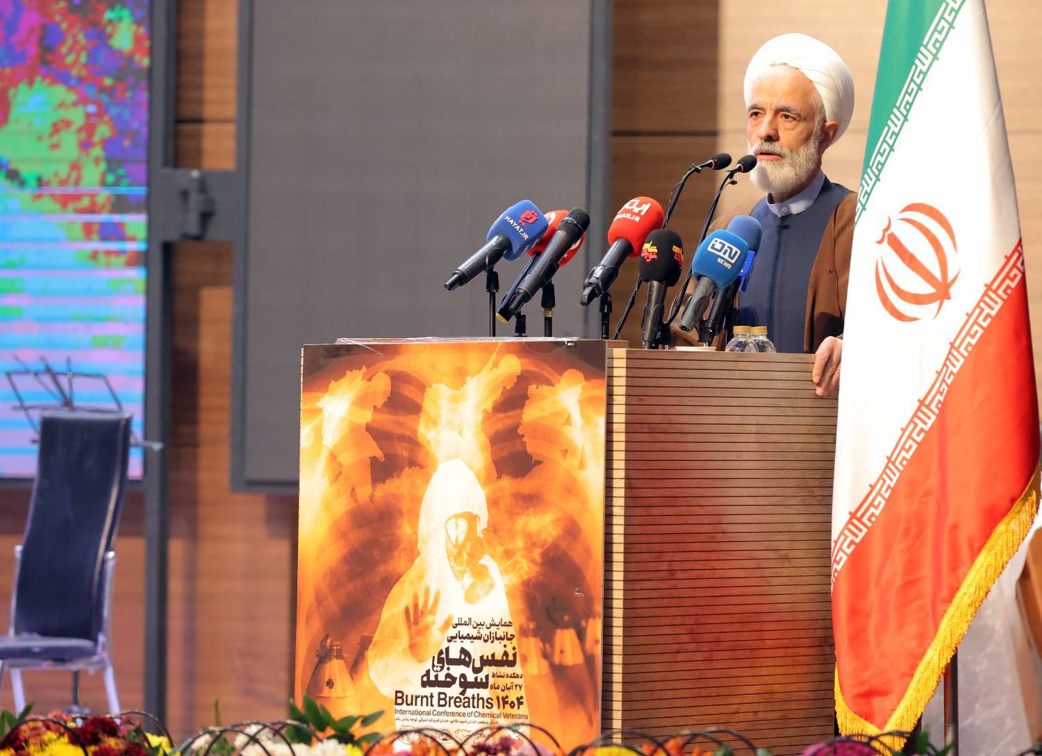 “The First International Conference for Victims of Chemical Weapons, Burned Breaths, was held today in Tehran, attended by Saeed Ohadi, Majid Ansari, and Ramadan Mousavi-Moqaddam.”